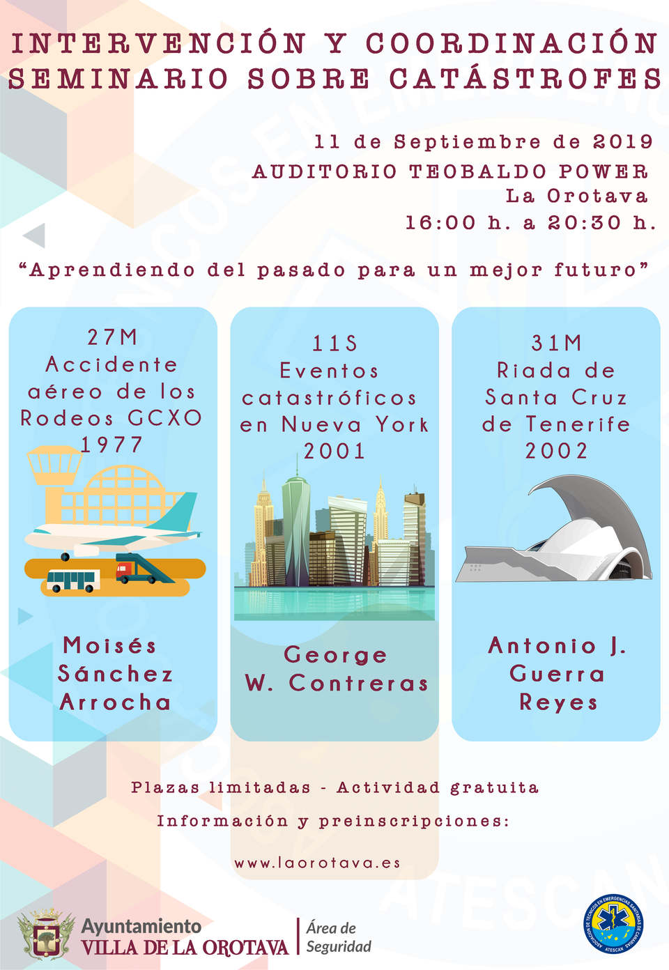 “Aprendiendo del pasado para un mejor futuro” es el lema del seminario sobre catástrofes que se celebrará el próximo 11 de septiembre en La Orotava, dirigido a efectivos de los diferentes cuerpos de seguridad y emergencia que actúan en este tipo de situaciones. La jornada, que se desarrollará en el Auditorio Teobaldo Power entre las 16.00 y las 20.30 horas, es totalmente gratuita, pero será necesario realizar preinscripciones ya que las plazas son limitadas.