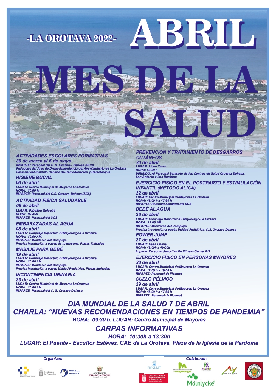 El Ayuntamiento de La Orotava, a través de la concejalía de Sanidad junto al Centro de Salud Las Dehesas, otros colaboradores y concejalías como la de igualdad, ha elaborado un amplio programa durante todo el mes de abril para conmemorar el Día Mundial de la Salud, que tiene lugar este 7 de abril. Así, esta misma jornada se cuenta con stands informativos en el Puente de la calle Escultor Estévez, en el CAE de la Orotava, plaza frente a la Iglesia de la Concepción y en la plaza de la iglesia de La Perdoma. Mientras que el Centro Municipal de Mayores acoge la charla “Nuevas recomendaciones en tiempos de pandemia”.