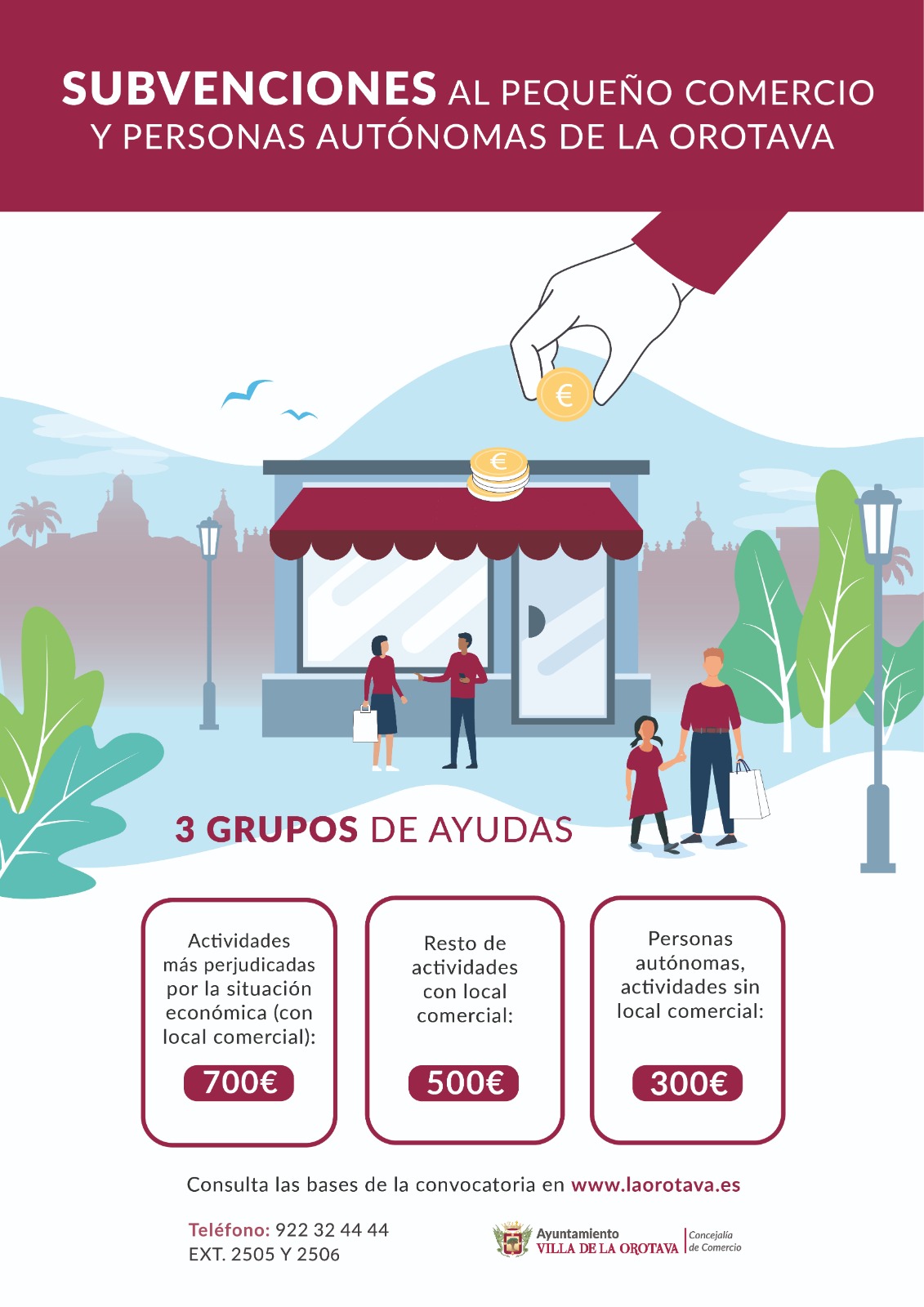 El Ayuntamiento de La Orotava, otro año más, otorgará una subvención para ayudar a las pymes y autónomos en el mantenimiento de la actividad de los negocios de la Villa más afectados por la crisis derivada de la Covid-19. En esta edición, existen tres categorías de subvenciones que puede recibir cada beneficiario en función de la actividad laboral que desarrolle.