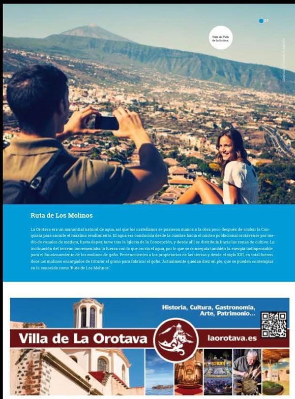 La publicación dedica 4 páginas a la promoción del municipio. Bajo el título ‘Patrimonio a la Vista’ versa de su historia, arte, cultura, gastronomía, qué ver, encantos del casco histórico, la ruta de los molinos, su arte efímero y la procedencia del nombre guanche...
