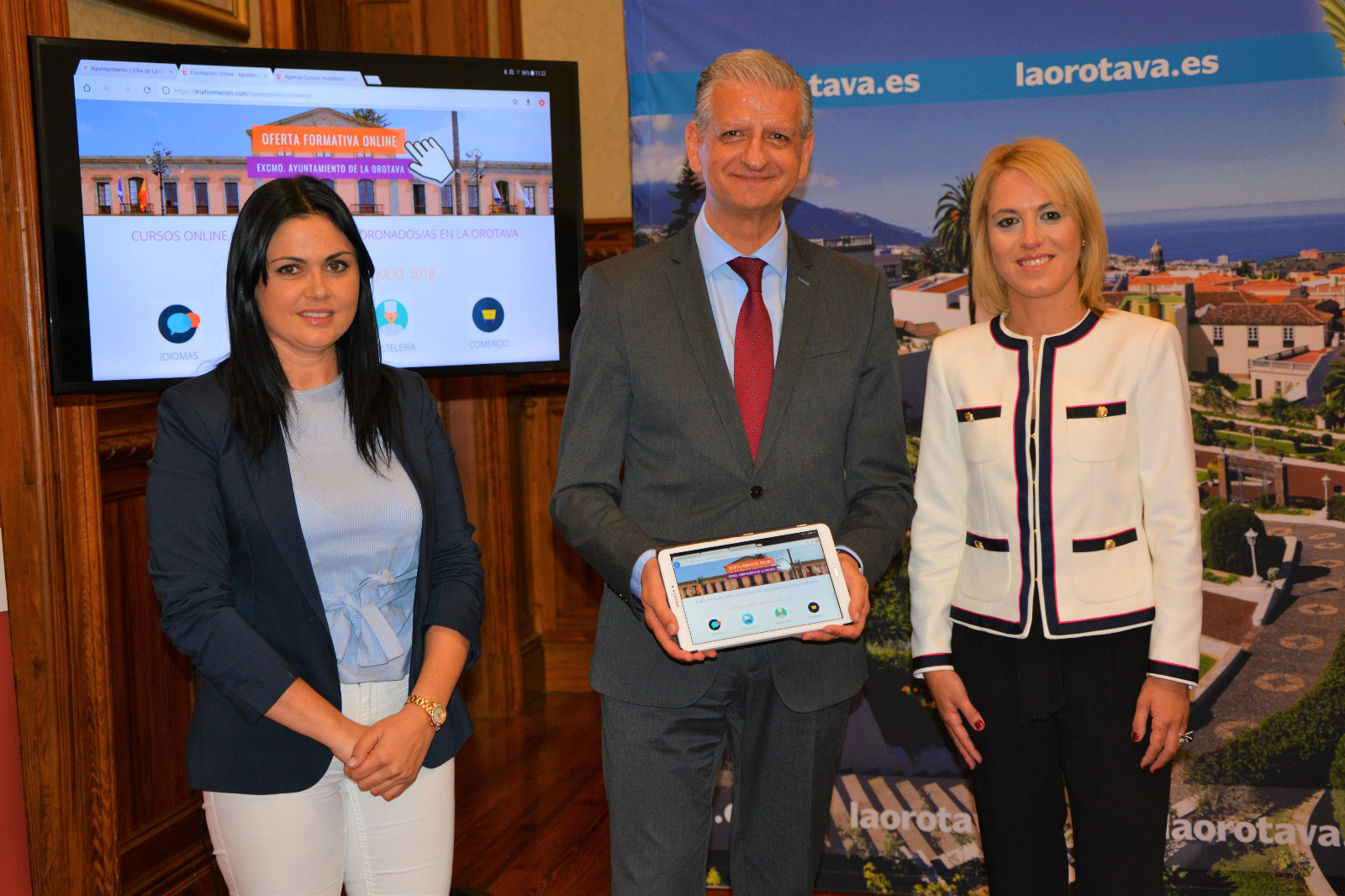El alcalde de La Orotava, Francisco Linares, y la concejala delegada de Juventud, Yurena Luis, han presentado la nueva plataforma online formativa que oferta la institución local. La escuela virtual, a la que se puede acceder directamente desde la web corporativa laOrotava.es, ofrece más de 400 cursos totalmente gratuitos para los orotavenses. El único requisito será estar empadronado en el municipio villero. Esta novedosa iniciativa, que se suma a otra amplia oferta formativa presencial que realiza el ayuntamiento a través de distintas áreas, se lleva a cabo gracias a un convenio con la entidad Tria Formación, homologada por el Servicio Canario de Empleo. Así en la presentación de la plataforma también se contó con la directora de la citada entidad, Natalia Triana.