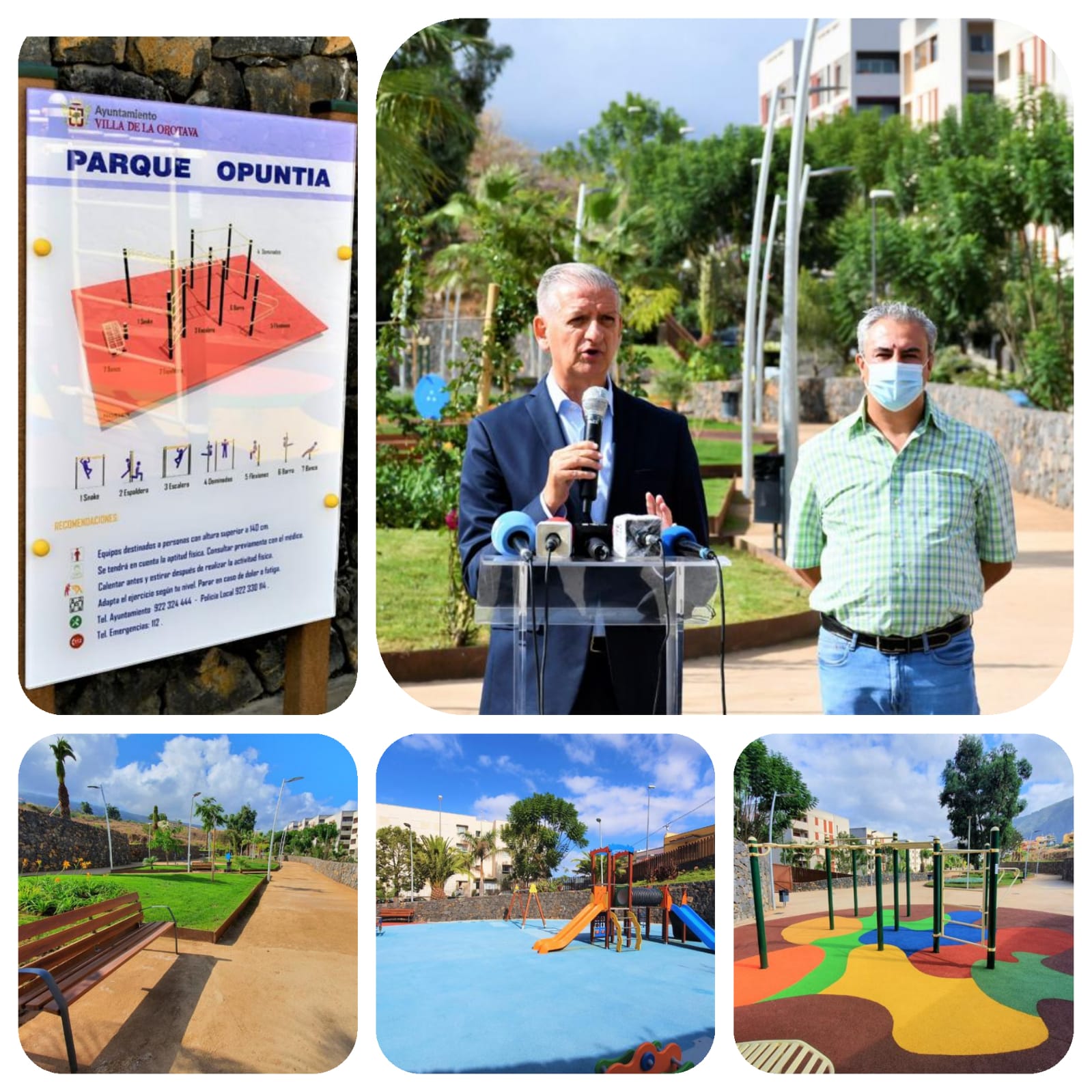 La Orotava cuenta desde este martes [3 de noviembre] con un nuevo parque, un espacio abierto de 6.000 metros cuadrados que se destina principalmente al ocio y el deporte. El recinto, que se ubica concretamente en la zona de Opuntia, se ha desarrollado en varias fases y la inversión global del proyecto ascendió al millón de euros. En la primera fase del parque se invirtieron unos 600.000 euros, sufragados por el Cabildo de Tenerife y el ayuntamiento villero. La segunda fase la adjudicó el consistorio por 400.000 euros a la empresa Obras Geotécnica de Canarias. La intención de la institución local era abrir este espacio entre mayo y junio del presente año, pero la situación generada por el estado de alarma meses atrás provocó el retraso hasta esta fecha.