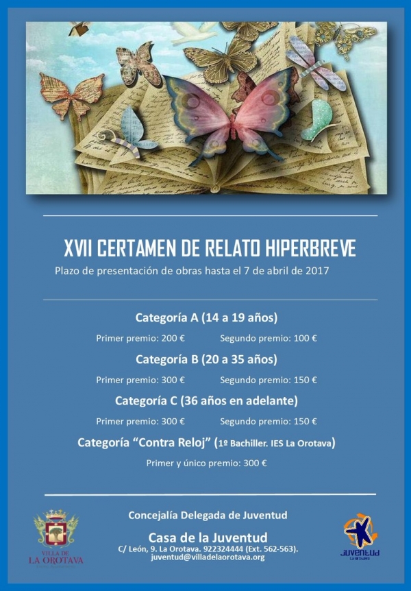 Todas aquellas personas interesadas en participar en esta iniciativa tienen de plazo hasta el 7 de abril para presentar sus relatos hiperbreves, ya sea a través del Registro General del Ayuntamiento de La Orotava, en horario de 08:30 a 13:00 horas, como por correo ordinario a la dirección: Casa de la Juventud, C/ León, nº 9, 38300, La Orotava o por correo electrónico a juventud@villadelaorotava.org.