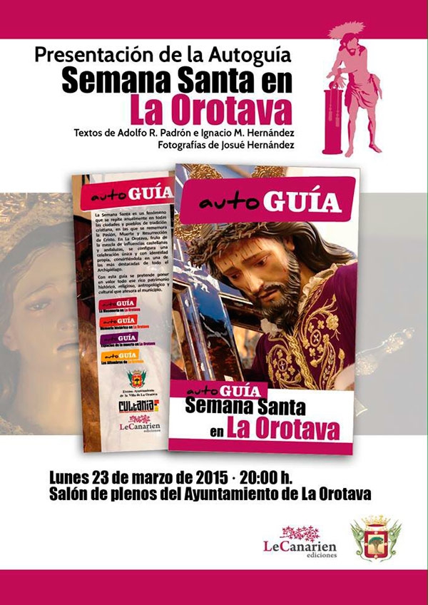 Este próximo lunes 23 de marzo, a las 20:00 horas, en el Salón de Plenos del Ayuntamiento de La Orotava tendrá lugar el acto de presentación de la tercera guía de la Colección de AutoGUÍAS históricas de La Orotava, "La Semana Santa en La Orotava", dedicada al rico patrimonio religioso del municipio, con especial mención a sus templos, su imaginería, los bienes de culto y el amplio número de tradiciones procesionales que se desarrollan durante la Semana Santa orotavense.