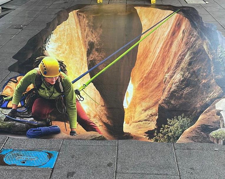 Estas cuatro ilusiones ópticas están realizadas de vinilo y adheridas al suelo. Se trata de una técnica pictórica que intenta engañar a la vista jugando con el entorno arquitectónico, la perspectiva, el sombreado y otros efectos ópticos de fingimiento, consiguiendo una realidad intensificada.