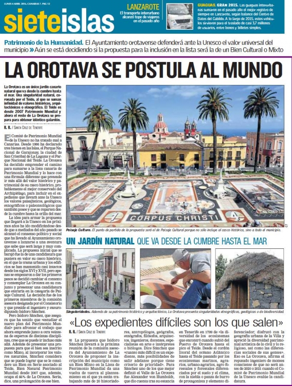 Reportaje publicado en el periódico Canarias 7 sobre la aspiración de La Orotava a convertirse enl Patrimonio Mundial.