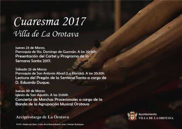 El próximo jueves 23 de marzo, la Parroquia de Santo Domingo de Guzmán acogerá la presentación del Cartel y Programa de la Semana Santa 2017. Según explica el concejal de Patrimonio Histórico, Narciso Pérez, “la comisión mixta de Semana Santa compuesta por todas las hermandades y parroquias del municipio, ha elegido la imagen de Jesús del Despojo para anunciar la llegada de esta semana grande”. Se trata de una talla en madera policromada, de 1999, del escultor local Pablo Torres Luis. Es una de las últimas imágenes procesionales incorporadas a la Semana Santa de La Orotava, aportando un sesgo de contemporaneidad a la celebración de la Pasión y Muerte de Cristo en la Villa, influenciado no obstante por la tradición de la imaginería sacra insular.
