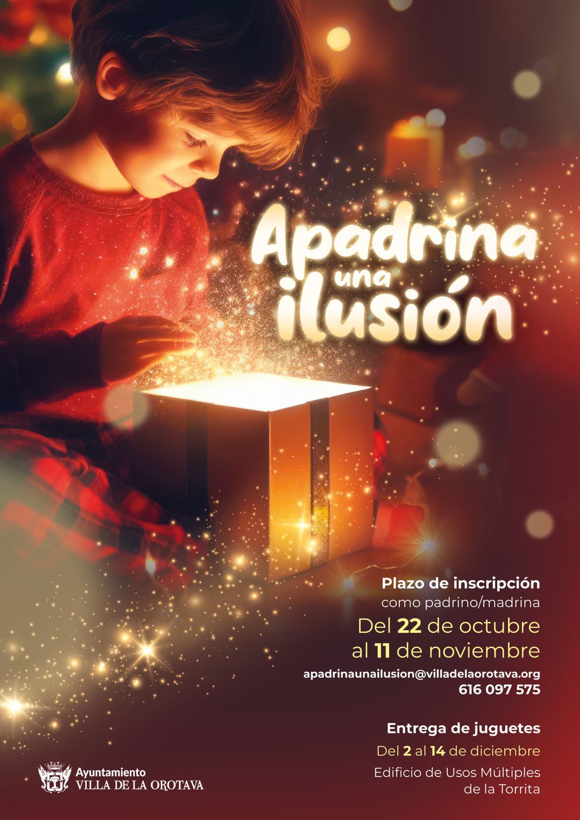 El plazo de inscripción para los padrinos y madrinas comenzó este pasado 22 de octubre y culmina el 11 de noviembre, y se debe realizar a través del correo apadrinaunailusion@villadelaorotava.org También se puede contactar en el teléfono 616097575. Se debe aportar nombre, apellidos, correo electrónico y número de teléfono. Estos datos se mantendrán, evidentemente, en el anonimato. Posteriormente los participantes en esta campaña solidaria recibirán información en la que se indica lo que le corresponde a cada uno, para que entreguen los juguetes del 2 al 14 de diciembre en el edificio de Usos Múltiples de La Torrita.
