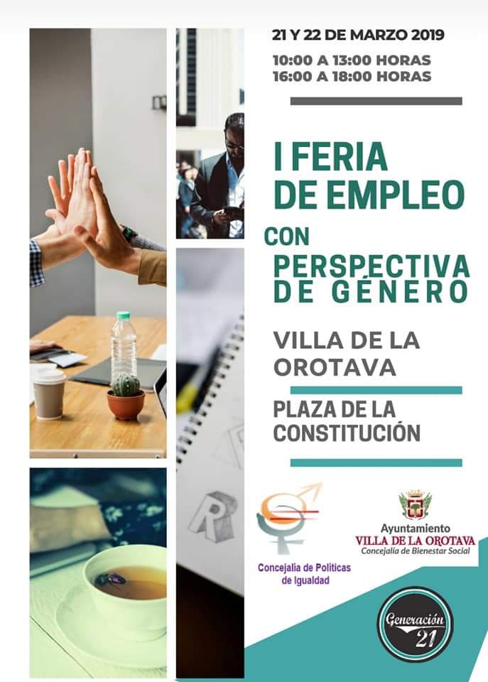 La Orotava, y en concreto la Plaza de la Constitución, acogerá los próximos días 21 y 22 de marzo, una Feria de Empleo con Perspectiva de Género, que organiza la Concejalía de Políticas de Igualdad dirigida por Belén González, y cuenta la colaboración de la entidad Generación 21. Esta iniciativa está enmarcada en el programa de actos del mes de marzo que conmemora del Día Internacional de la Mujer. Durante las jornadas, se desarrollarán diversas actividades para orientar y formar en materia de igualdad relacionada con el trabajo. Se contará con una quincena de estands, y una carpa central en la que se desarrollarán las conferencias.