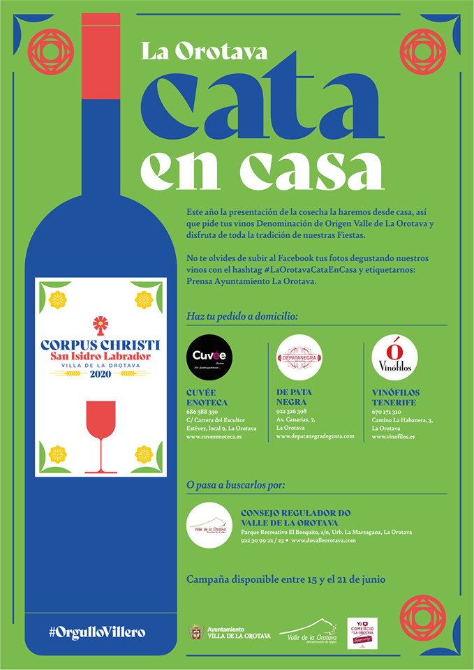 De esta manera, y dentro de la programación virtual de los festejos, se han puesto en marcha la iniciativa ‘La Orotava cata en casa’, con la que los orotavenses pueden disfrutar en sus hogares de los mejores vinos del Valle de La Orotava. Además, se invita a los vecinos y vecinas a subir a Facebook sus fotografías degustando los vinos con el hashtag #LaOrotavaCataEnCasa, y etiquetando Prensa Ayuntamiento La Orotava.