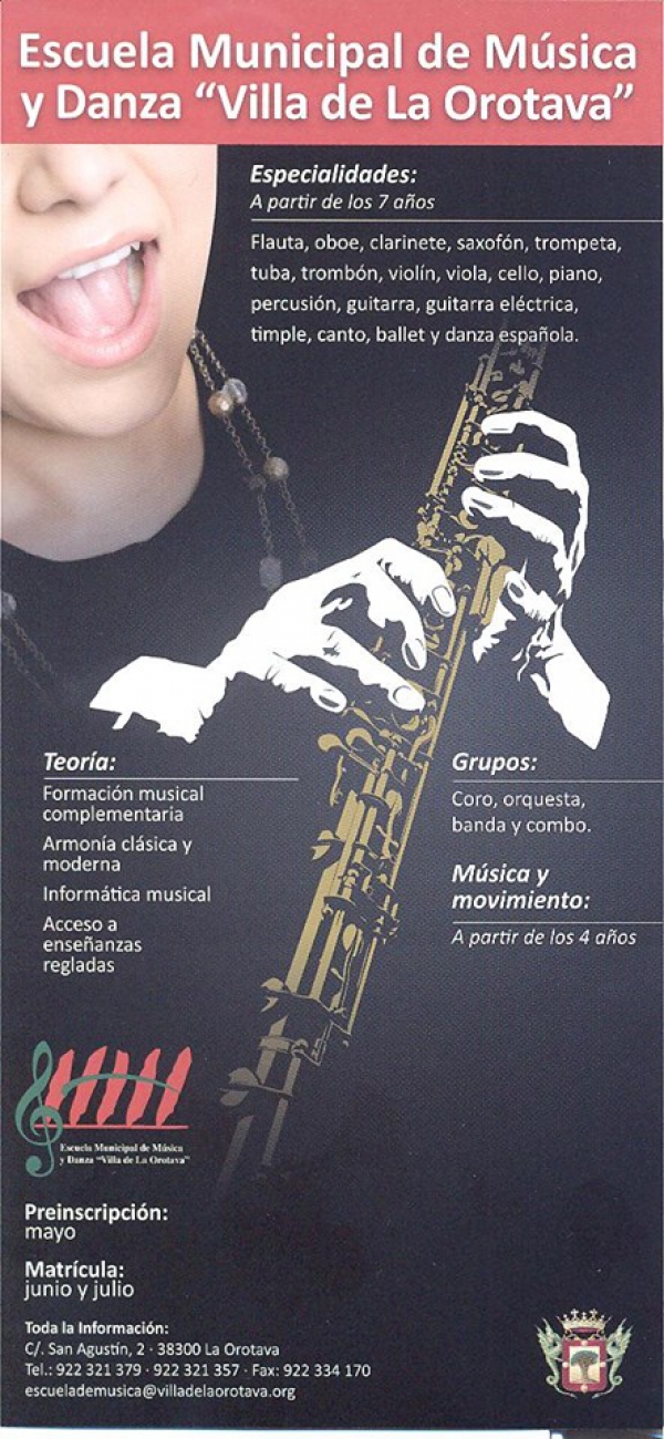 Del 2 al 19 de mayo estará abierto el plazo para la PREINSCRIPCIÓN. A partir de 4 años. Ya se puede solicitar información y recoger la documentación necesaria en la secretaría de la Escuela. 922 321 379