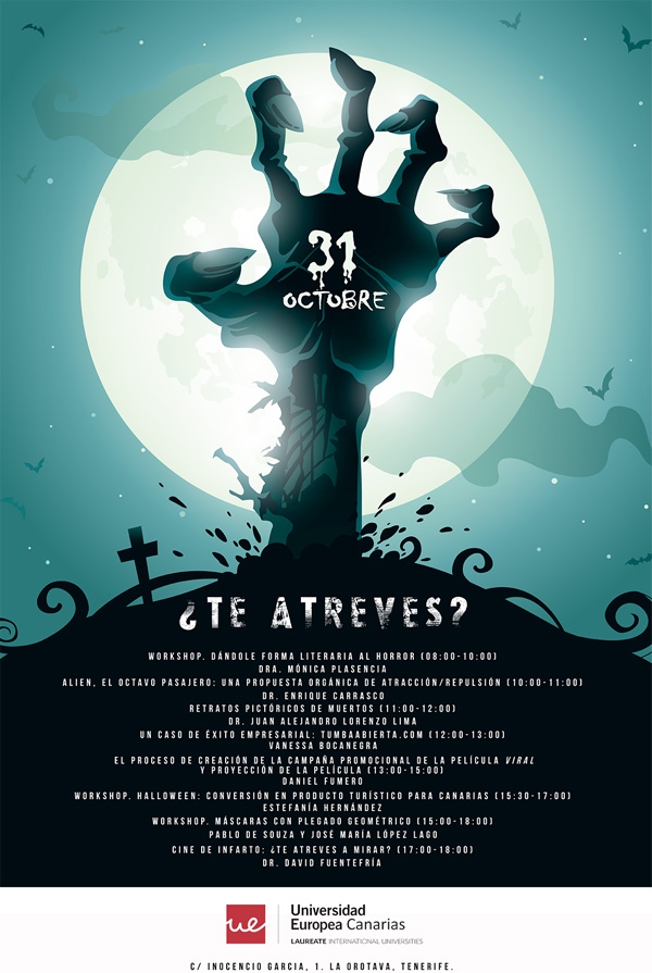 La Universidad Europea de Canarias celebrará el viernes, 31 de octubre, en su sede de La Orotava (Tenerife) la fiesta de Halloween con conferencias, talleres, un maratón de cine de terror y con el juego de "truco o trato" para los más pequeños. Estas actividades se llevarán a cabo durante toda la jornada y estarán abiertas a cualquier persona que quiera participar en ellas.