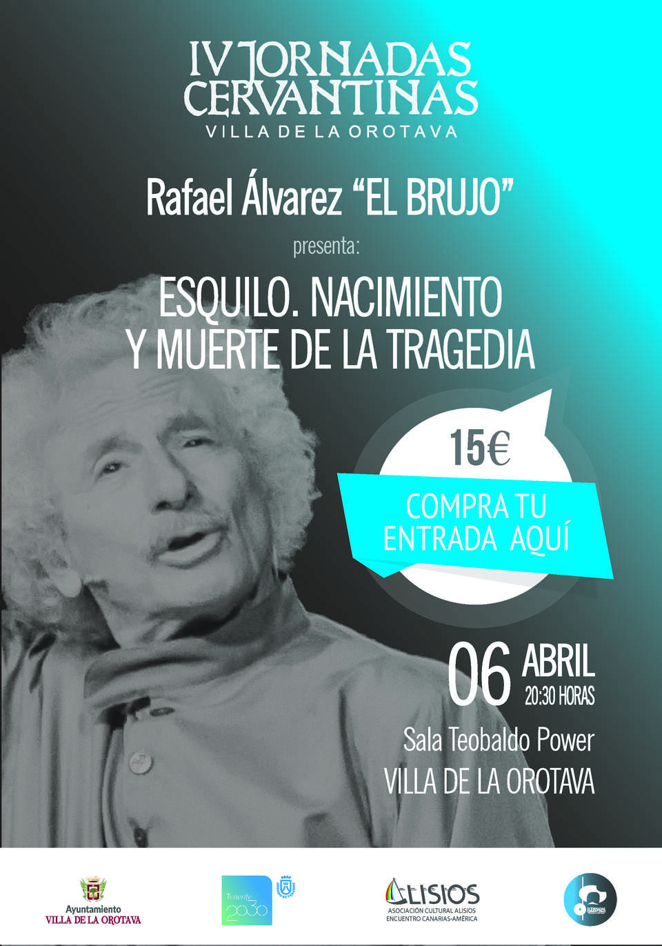 18 de marzo de 2019.- Las IV Jornadas Cervantinas Villa de La Orotova organizadas por la Asociación Cultural Alisios en colaboración con el Ayuntamiento de La Orotava y el Cabildo de Tenerife ha programado como acto principal de esta edición, la función “Esquilo: Nacimiento y muerte de la tragedia” del actor y cómico Rafael Álvarez “El Brujo” cuyas entradas ya están a la venta.