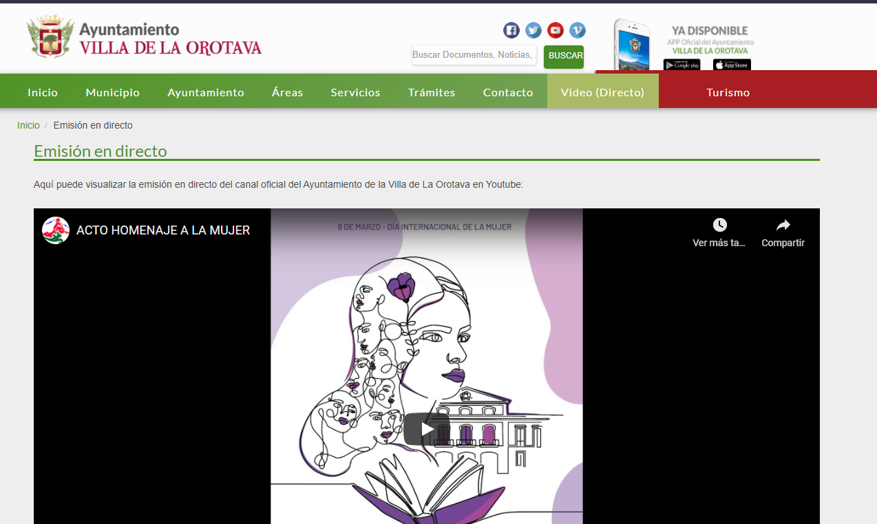 El Ayuntamiento de La Orotava informa que se ha implementado una página específica dentro de la web corporativa (https://www.laorotava.es/ayuntamiento) donde se podrán visualizar en directo los actos que se retransmitan en ‘streaming’ a través del Canal Oficial de la corporación en Youtube.