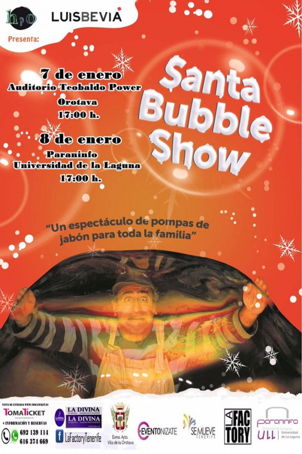 El Auditorio Teobaldo Power de La Orotava y el Paraninfo de la Universidad (ULL) recibirán los días 7 y 8 de enero respectivamente esta visita especial de Luis Beviá, considerado uno de los mejores artistas del mundo en la elaboración de pompas de jabón. 'Santa Bubble Show’, un evento para toda la familia, ha rodado ya