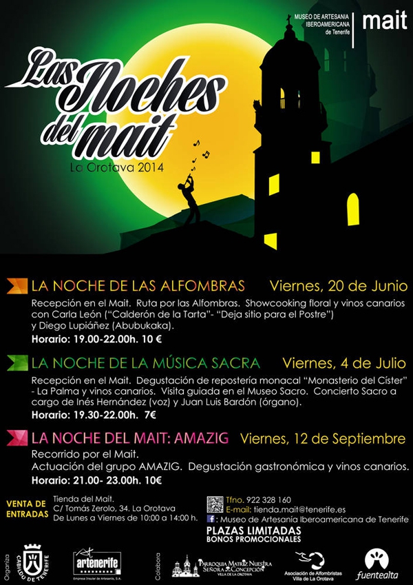 Para esta nueva edición se han programado tres noches: la de las alfombras; la de Música Sacra y la del MAIT. Cada una de ellas contará con una visita guiada, una representación de artes escénicas y una degustación gastronómica. El Museo de las Alfombras y Museo Sacro de la Iglesia de la Concepción colabora con esta iniciativa nacida en 2010. Sus actividades están dirigidas a todo tipo de público, sobre todo adulto. Comienzan a las 19.00 horas y tienen una duración aproximada de tres horas. Para más información se puede visitar la tienda del MAIT o llamando al teléfono: 922 32 81 60.