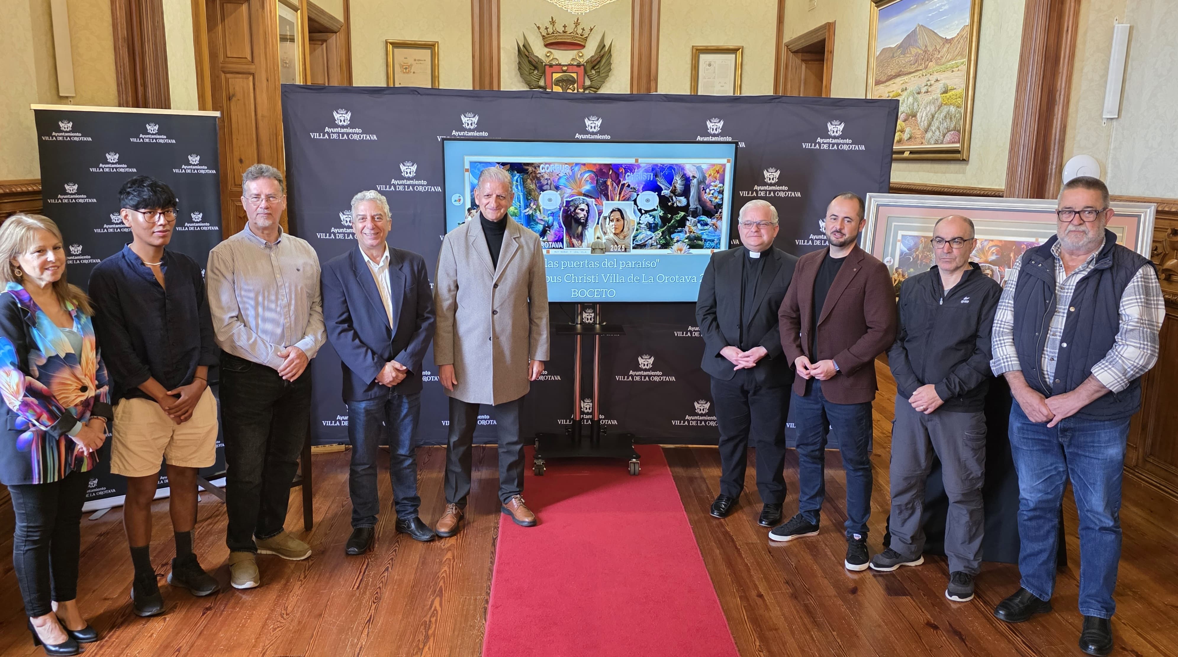 El salón noble del consistorio villero acogió en la mañana de este lunes [28 de abril] la presentación del boceto del magno tapiz de la plaza del Ayuntamiento que se confecciona cada año en honor al Corpus Christi y que lleva por título ‘A las puertas del paraíso’. El director de la Alfombra, Domingo González Expósito explicó los detalles acompañado del alcalde Francisco Linares, el concejal de Fiestas, Alexis Pacheco y el cura párroco de la Iglesia de La Concepción, Honorio J. Campos. En el acto también se contó con representantes de la Asociación de Alfombristas y miembros del colectivo Artearena. En la primera quincena de mayo se comenzará con la instalación de las carpas y marcar los primeros trazos.