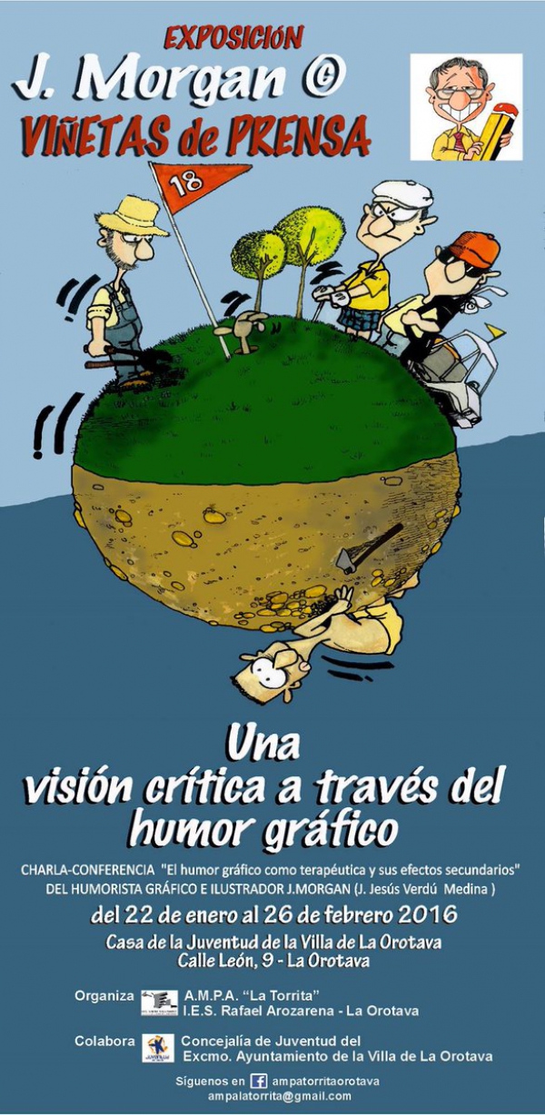 La Villa de La Orotava podrá disfrutar en directo de las famosas viñetas de prensa de J.Morgan (J. Jesús Verdú Medina). El humorista gráfico e ilustrador que publica desde 1983 en el Canarias 7 visita el próximo viernes 22 el municipio; en la mañana ofrecerá unos talleres de iniciación y acercamiento al dibujo humorístico a alumnos del IES Rafael Arozarena de La Orotava y, por la tarde, impartirá una charla-conferencia, además de inaugurarse su exposición que quedará abierta hasta finales de febrero.