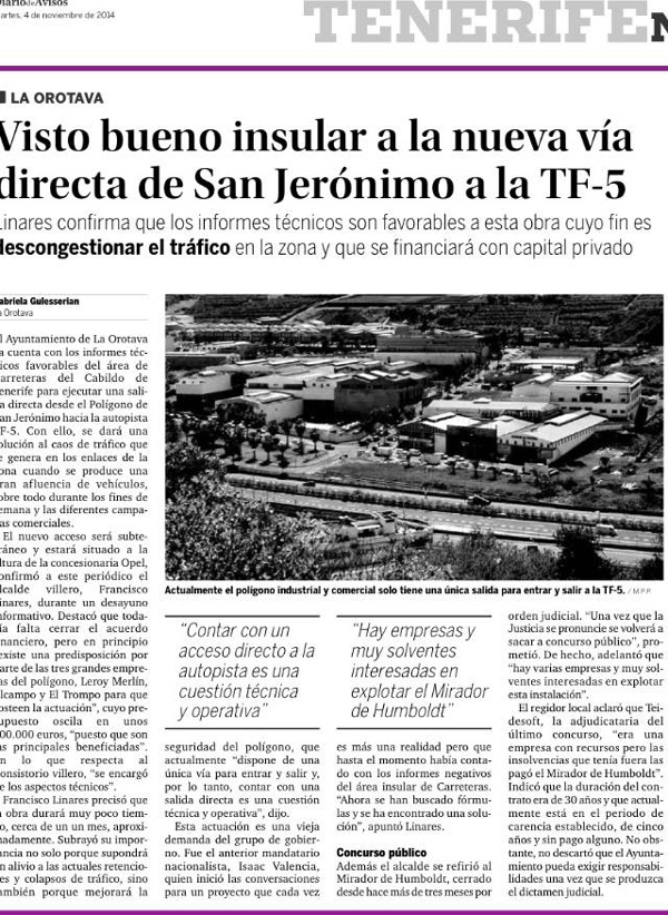 El alcalde de La Orotava y vicesecretario de Coordinación y Políticas Sectoriales de Coalición Canaria en Tenerife, Francisco Linares, plantea que se cree un tercer carril en la autopista del Norte (TF-5) para evitar los atascos que se producen, sobre todo a primera hora de la mañana, en dirección Santa Cruz de Tenerife. Linares considera que debe estudiarse la opción de crear ese tercer carril, al menos en dirección hacia la capital, que es donde se producen las retenciones de forma habitual.