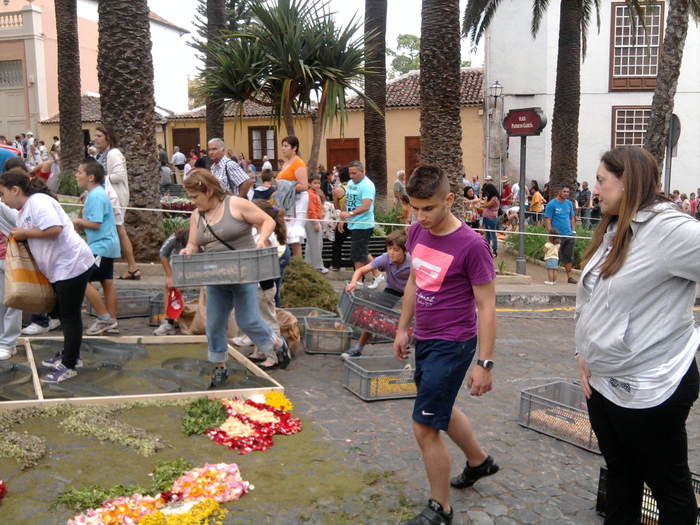 El Mercadillo Valle de La Orotava acoge la mañana de esta sábado, 22 de junio, un conjunto de actos en el marco de una jornada de homenaje a las tradiciones festivas de la Villa, entre los que destaca la elaboración de una alfombra tradicional con flores a cargo de un grupo de miembros de la Asociación de Alfombristas del municipio.