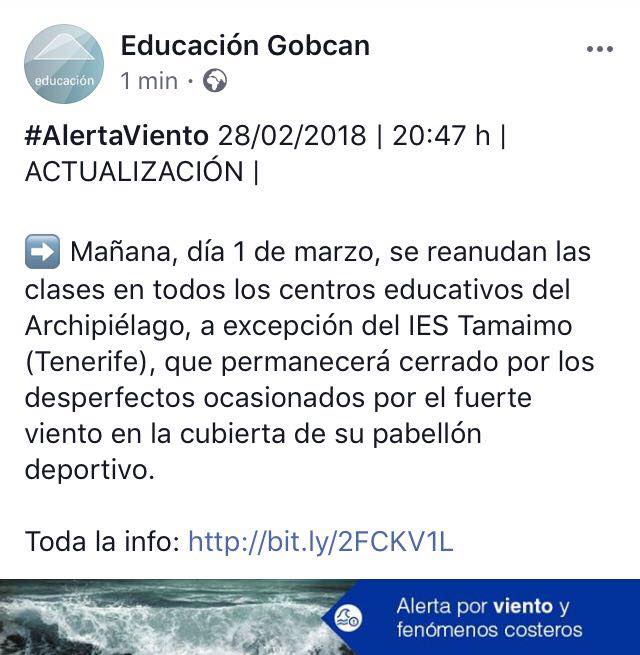 La Dirección General de Centros e Infraestructura Educativa del Gobierno de Canarias, de acuerdo a la recomendación de la Dirección General de Seguridad y Emergencias, ha resuelto que todas las actividades de los centros educativos del Archipiélago se reanuden mañana, día 1 de marzo de 2018, una vez evaluada la previsión meteorológica para toda la jornada.