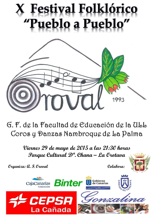 El Festival Folklórico "Oroval Pueblo a Pueblo" será el 29 de mayo, en el Parque Cultural Dña. Chana, en La Orotava, a partir de la 21:30. Para este año, contaremos con la colaboración de dos colectivos folklóricos. En primer lugar actuará el Grupo Folklórico de la Facultad de Educación de la Universidad de La Laguna, que harán un repertorio musical de lo más tradicional, dedicado al noroeste de la isla de Tenerife. En segundo lugar, actuará Coros y Danzas Nambroque de La Palma, venida desde la capital palmera, para presentarnos un nutrido número de piezas del folklore de "la Isla Bonita". Y para finalizar, la Agrupación Folklórica Oroval, nos ofrecerá un repertorio renovado de folklore de las islas, haciendo, inclusive, un guiño a la isla de La Graciosa.