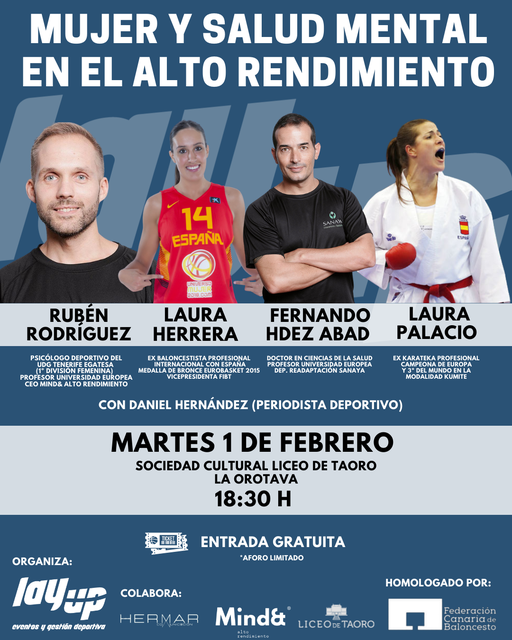 Desde LAY UP Gestión y Eventos Deportivos, empresa organizadora de esta mesa redonda, se considera que este es “un buen momento para hablar de salud mental, ya que cada día nos preocupamos más por cómo nos sentimos y eso hace que nos hagamos muchas preguntas que quizás en esta charla, escuchando las experiencias y los conocimientos de los ponentes, podamos responder”. Son palabras de Grego Hernández, director de LAY UP, quien asevera que “puede ser atractivo para el público escuchar a deportistas como Laura Herrera y Laura Palacio, junto a dos grandísimos conocedores de la Psicología y el Rendimiento Físico como son Rubén Rodríguez y Fernando Hernández Abad”.