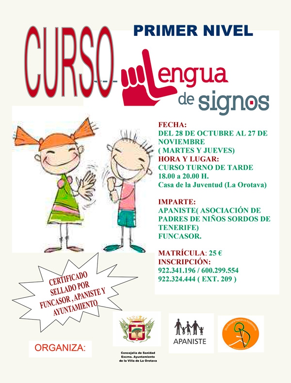 La Concejalía de Sanidad del Ayuntamiento de La Orotava, a través de la Oficina Municipal de Atención a las Drogodependencias, y la Asociación de Padres de Niños Sordos de Tenerife (APANISTE) organizan una nueva edición del Curso de Lengua de Signos de primer nivel para el que ya está abierto el plazo de inscripción.