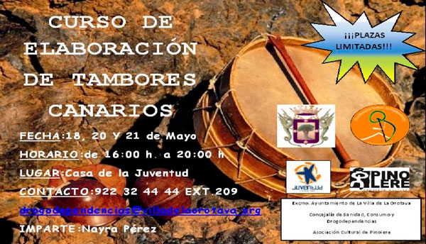 Se trata de un taller de elaboración de tambores tradicionales canarios de doce horas de duración que se impartirá en horario de tarde, los días 18, 20 y 21 de mayo, en la Casa de la Juventud.