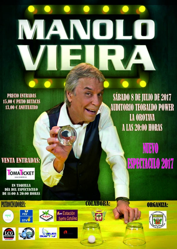 El Auditorio Teobaldo Power de La Orotava acoge el próximo sábado 8 de julio, a las 20:00 horas, el nuevo espectáculo de Manolo Vieira. Entradas a 15 euros, en patio butacas, y 13 euros en anfiteatro. Se pueden adquirir a través de la plataforma http://www.tomaticket.es/entradas-manolo-vieira-la-orotava y el día del espectáculo en taquilla de 11:00 a 20:00 horas.