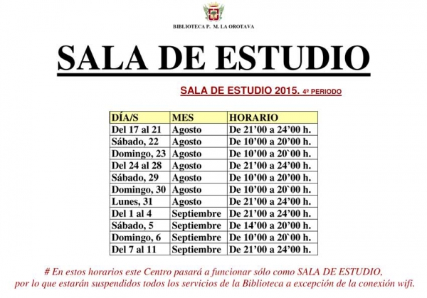Se recuerda a todos los usuarios de este centro que durante estos horarios extraordinarios de SALA DE ESTUDIO, todos los servicios bibliotecarios estarán suprimidos a excepción de la conexión wi-fi.