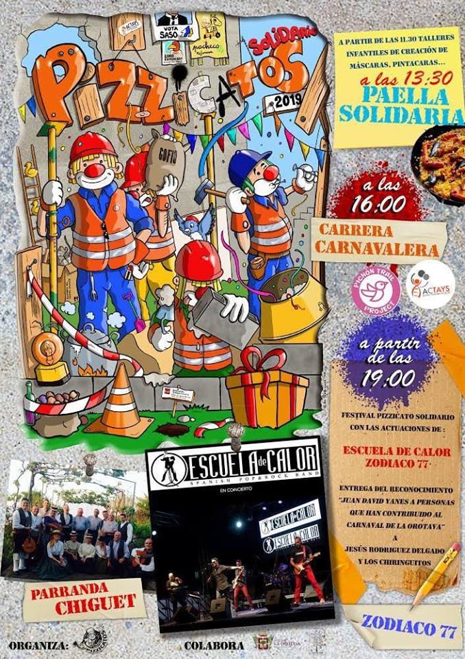 El XII Pizzicatos Solidario, la III Muestra Solidaria y la IV Carrera Carnavalera tendrán lugar este sábado 2 de marzo, en la Plaza de la Constitución y su entorno. Estas actividades, organizadas por la murga Pizzicatos en colaboración con la concejalía de Fiestas del Ayuntamiento de La Orotava, tienen por objeto promover un carnaval solidario, “no solo desde las tablas sino a pie de calle”, tal y como cuentan desde la agrupación musical.