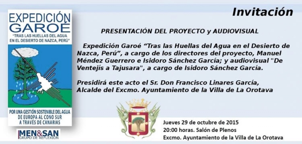 El Salón Noble de la Casa Consistorial acogerá el próximo jueves, 29 de octubre, a las 20:00 horas, la presentación de la Expedición Garoé «Tras las huellas del agua en el desierto de Nazca, Perú», correrá a cargo de los directores del proyecto, Manuel Méndez Guerrero e Isidoro Sánchez García.