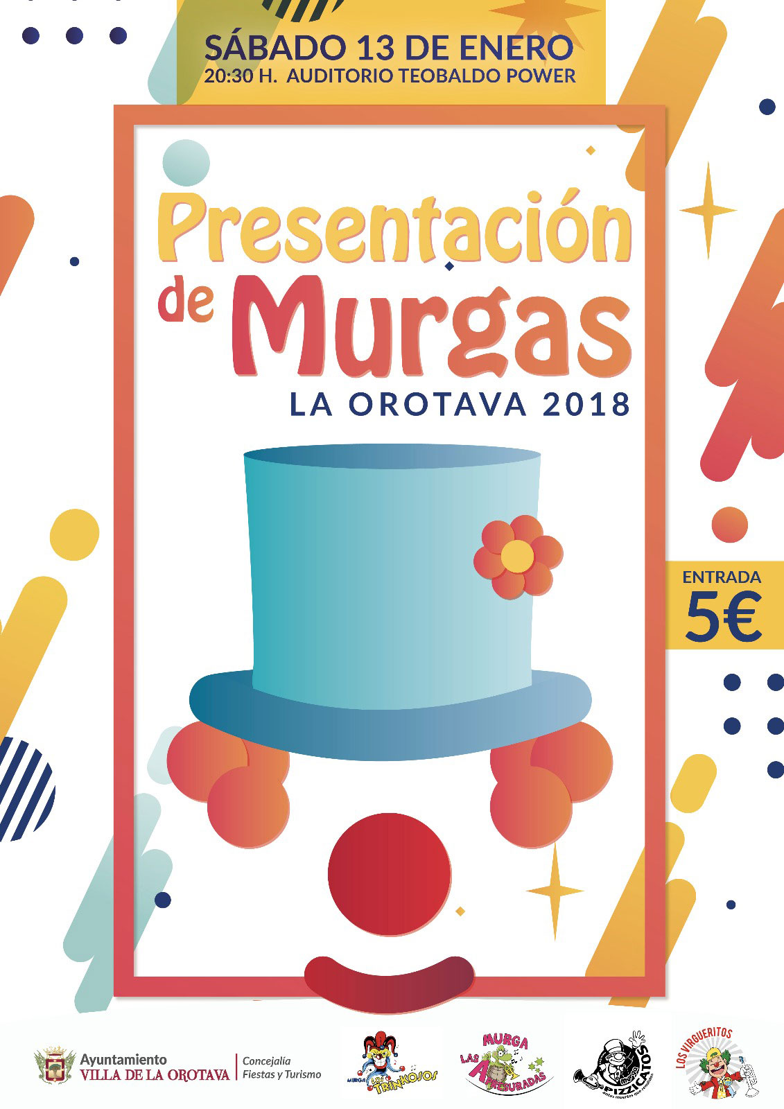 El Auditorio Teobaldo Power acoge este sábado 13 de enero, a partir de las 20:30 horas, el acto de presentación conjunta de las Murgas de La Orotava- Virgueritos, Apresuradas, Trinkosos y Pizzicatos.