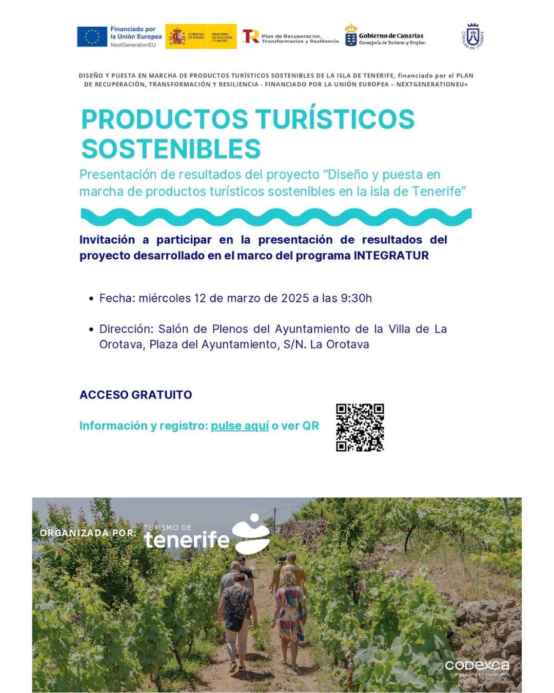 El próximo miércoles 12 de marzo, a las 9.30 horas, el Salón de Plenos del Ayuntamiento de la Villa de La Orotava será el escenario de la presentación de resultados del proyecto de Desarrollo de Productos Turísticos Sostenibles en Tenerife, enmarcado dentro del Plan de Sostenibilidad Turística en Destino "Tenerife RESET", impulsado por el Cabildo de Tenerife y financiado a través de la Secretaría de Estado de Turismo del Gobierno de España. Esta iniciativa ha supuesto un esfuerzo estratégico para fortalecer el posicionamiento de Tenerife como un destino líder en ecoturismo, integrando sostenibilidad, innovación y oportunidades económicas para el tejido empresarial local.