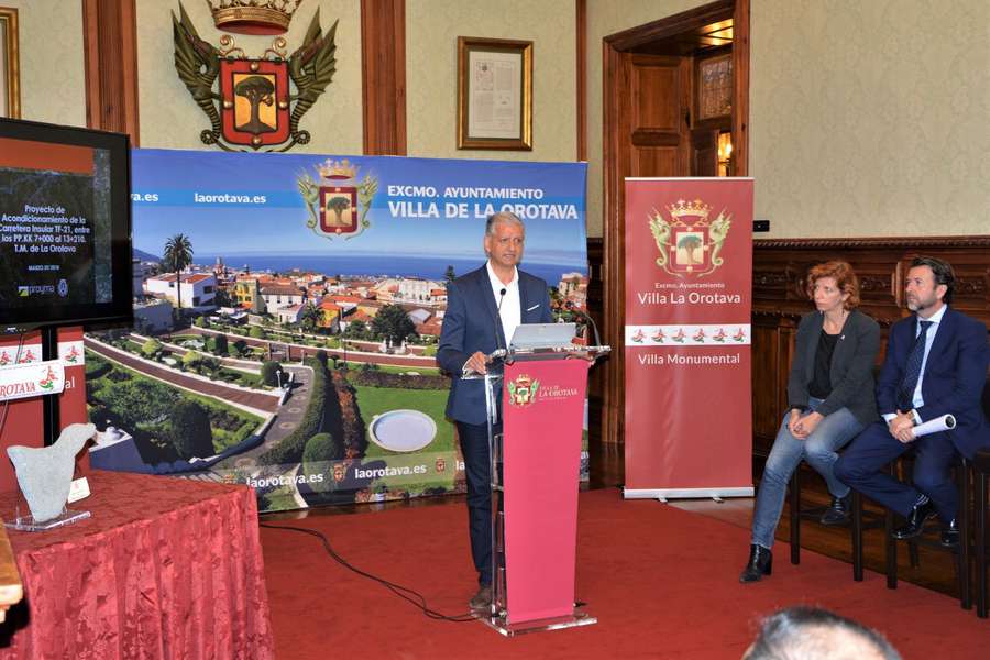 El presidente del Cabildo de Tenerife, Carlos Alonso, y el alcalde de La Orotava, Francisco Linares, han presentado este viernes [23 de marzo] en el Salón Noble del Consistorio villero el proyecto de acondicionamiento de un tramo de la TF- 21. En concreto la actuación afectará a seis kilómetros que se encuentran entre el punto kilométrico 7 y el 13´2, aproximadamente entre el Camino de La Sierra -El Sauce en Barroso a Cueva del Negro, en Cañeño. Durante el acto de presentación también se contó con la directora insular de Carreteras, Ofelia Manjón; los ediles delegados de Seguridad y Servicios Generales, Narciso Pérez y Felipe David Benítez, y los concejales responsables de los distritos de los altos del municipio: Juan Dóniz, Yurena Luis, Delia Escobar y Alexis Pacheco. También se contó con representantes de la Asociación don Víctor y de las ocho asociaciones de vecinos de las medianías, autores del proyecto y técnicos insulares.