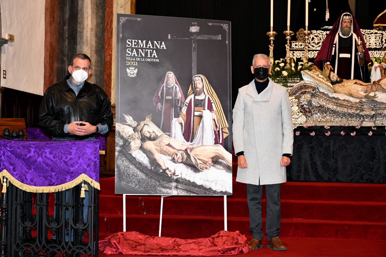 El cartel anunciador de la Semana Santa de La Orotava de este año es del popularmente conocido Señor Muerto, un cristo crucificado articulado que se transforma en imagen yacente. Su origen se sitúa en el primer tercio del siglo XVII, siendo atribuido al escultor jienense Francisco de Ocampo. Tras la desamortización de Mendizábal de 1835 y la consiguiente clausura del convento de frailes franciscanos de San Lorenzo, las tallas que constituían el desfile procesional del Santo Entierro pasaron a engrosar los bienes de la parroquia de San Juan Bautista no sin antes librar un largo pleito con la parroquia de Ntra. Sra. de la Concepción, de la que el templo de El Farrobo salió victorioso. No obstante, la organización de la procesión durante los años inmediatamente posteriores correspondió a ambas parroquias de manera alterna.