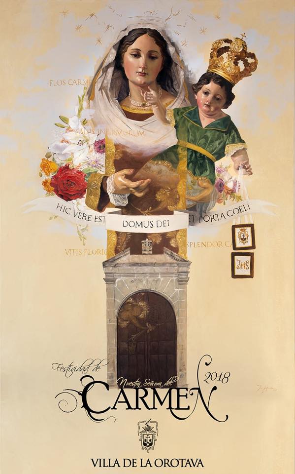PRESENTADO EL CARTEL OFICIAL DE LA FESTIVIDAD DE NTRA. SRA. DEL CARMEN DE LA VILLA DE LA OROTAVA 2018 La Ilustre y Venerable Cofradía de Nuestra Señora del Carmen Coronada ha presentado en la tarde de ayer, sábado 16 de junio en la parroquia de San Juan Bautista, el cartel anunciador de los Solemnes Cultos que se tributarán a ésta veneradísima imagen en el XXX aniversario de su Coronación Canónica y nombramiento de Alcaldesa Mayor, Perpetua y Honoraria de la Villa de La Orotava. El cartel es un óleo sobre tabla realizado por Josué Hernández, que presenta a la Virgen como «verdadera casa de Dios y Puerta del Cielo» en alusión a la importancia de la maternidad de la Virgen y su protección espiritual, especialmente en esta querida advocación, a través del símbolo del escapulario. El hábito de la Orden del Carmelo Descalzo, orden vinculada entrañablemente a esta cofradía, se convierte en un variado ramo de flores que recuerda que María es «viña florida», la «flor de la Villa» que goza de la devoción y el afecto de los orotavenses, que esperan su día grande el próximo 16 de julio.