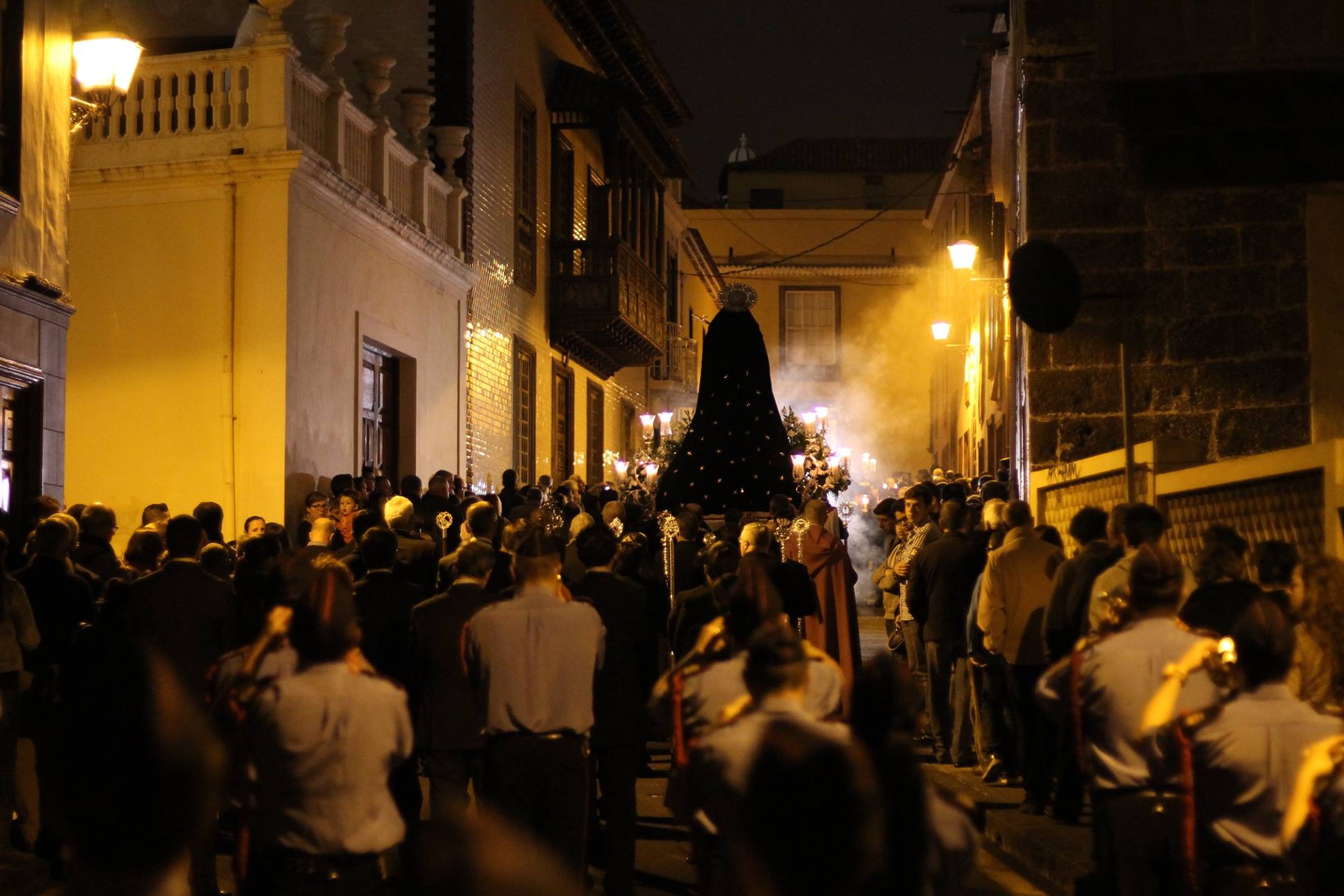 El entramado urbano y la ubicación de los templos en el Conjunto Histórico de la Villa de La Orotava han generado desde sus orígenes, un escenario natural condicionado por su particular orografía, que desde pronto se reveló como una excelente aliada en aras de manifestar los efectos espirituales y artísticos pretendidos por las autoridades eclesiásticas. La inclinación de las calles y, en ocasiones, su irregular trazado, proporcionan inmejorables perspectivas para la contemplación de los pasos procesionales y del desfile de las hermandades y demás protagonistas de la escenografía litúrgica. Ésta y otras cuestiones, no menos trascendentales, han configurado una Semana Santa especial, caracterizada por tres principales razones que la diferencian de las celebradas en el resto del Archipiélago. En primer lugar, la pervivencia de los “cargadores” que portan los tronos o basas de las imágenes, provistos de varales para ello, en contraposición a los carros y costaleros, modas foráneas que se han impuesto en otras semanas mayores de Canarias. En segundo lugar, la inexistencia de grupos escultóricos, lo que origina que cada paso procesional sea trasladado en su correspondiente trono, a excepción de las tres imágenes indivisibles – La Oración en el Huerto, La Piedad o el Cristo de El Calvario y Jesús Nazareno -. Durante los primeros momentos los tronos o basas eran simples estructuras de madera, de escasas dimensiones, con dos varales que transportaban imágenes de manera individual. Ejecutados por carpinteros integrantes de la reputada tradición de orfebres de la madera que ha caracterizado a la localidad a lo largo de su historia, a ellos acudían y acuden las hermandades como principales comitentes, aunque en tiempos pretéritos también lo hacían algunos donantes particulares y devotos que costeaban el gasto. El siglo XVIII marca el devenir estilístico de los tronos, aportándole una serie de características que perviven hasta la actualidad. Sobre una base cuadrangular descansaba una especia de peana alta cuyo trazado esbozaba ligeros movimientos ondulantes, acentuados en los vértices mediante plintos que sostenían jarrones con flores o velas. Tales molduras y en ocasiones cornisas completas, producían un evidente efecto arquitectónico. En el caso de los destinados a Cristos y Vírgenes, pueden presentar interesantes labores de talla en relieve, profusamente ornamentados con hojarascas, cenefas, cortinajes, etc. En cualquier caso y con independencia de sus características morfológicas, durante las procesiones los tronos son flanqueados por hileras de hermanos o cofrades que esperan su turno para ejercer el relevo de los citados “cargadores”.