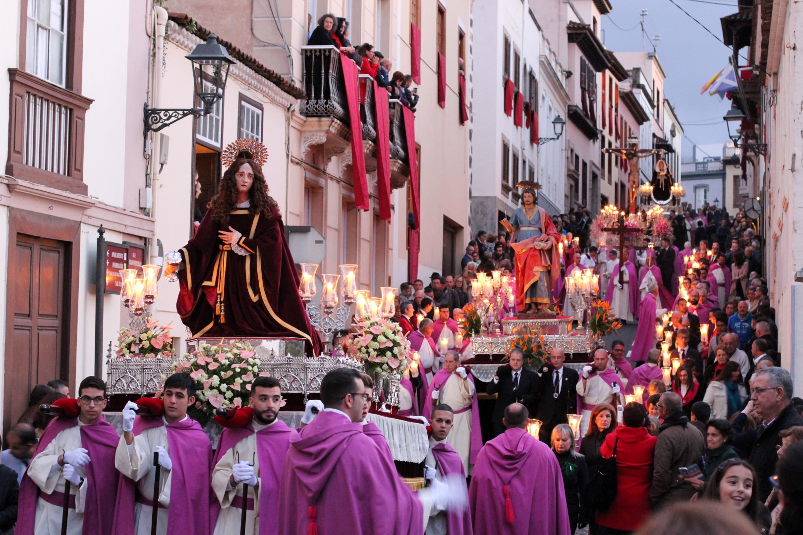 A las diez de la noche, con rigurosa puntualidad, parte la procesión desde la Iglesia de San Juan Bautista, acompañada de la Venerable Esclavitud y en dirección hacia la Plaza del Ayuntamiento. La salida de la imagen del Stmo. Cristo sobrecoge a cuantos la contemplan por su emotividad, en medio de un silencio tan sólo interrumpido por el canto de una malagueña. El cortejo se abre por el estandarte de la Esclavitud seguido de las cruces de manga. El primero de los cuatro pasos procesionales es el de Sta. María Magdalena, talla de vestir realizada por José Luján Pérez con posterioridad a 1801; seguido de San Juan Evangelista, popularmente conocido como “El Enamorado”, efectuado por el escultor local Fernando Estévez a comienzos del siglo XIX y que, junto a la Magdalena formaba parte del antiguo cortejo del Santo Entierro de la Iglesia conventual franciscana; el Stmo. Cristo a la Columna, talla donada por Francisco Leonardo de Guerra en 1689 y ejecutada por el imaginero sevillano Pedro Roldán o, al menos, por miembros de su taller, y se revela como una de las más sobresalientes esculturas religiosas de la Semana Santa no sólo local o insular sino dentro del panorama regional; y finalmente la Virgen de Gloria, una notable talla del citado Luján Pérez, datada entre 1799 y 1806, que se revela como un excelente ejercicio de técnica de paños encolados.