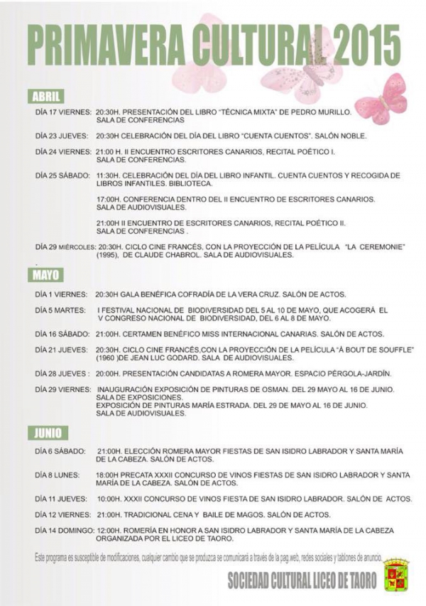 13/04/2015La Sociedad Liceo de Taoro ha publicado la programación cultural para esta primavera, en concreto desde el 17 de abril al 14 de junio.