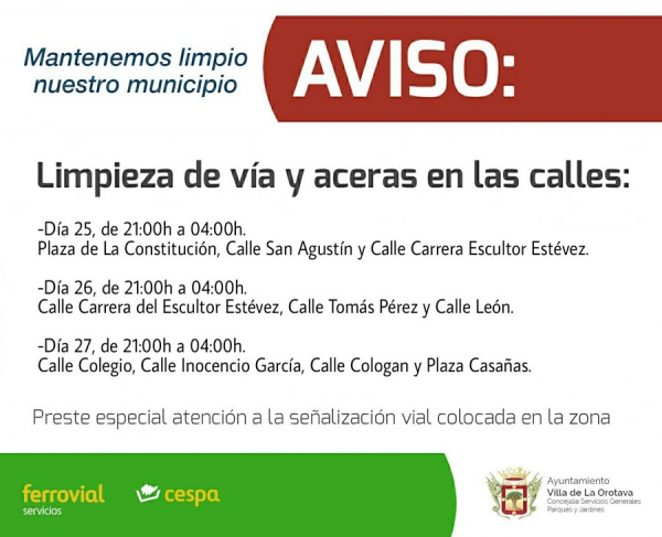 23/05/2016Los días 25, 26 y 27 de mayo se ha programado la limpieza de distinas zonas del casco urbano de La Orotava en horario nocturno.
