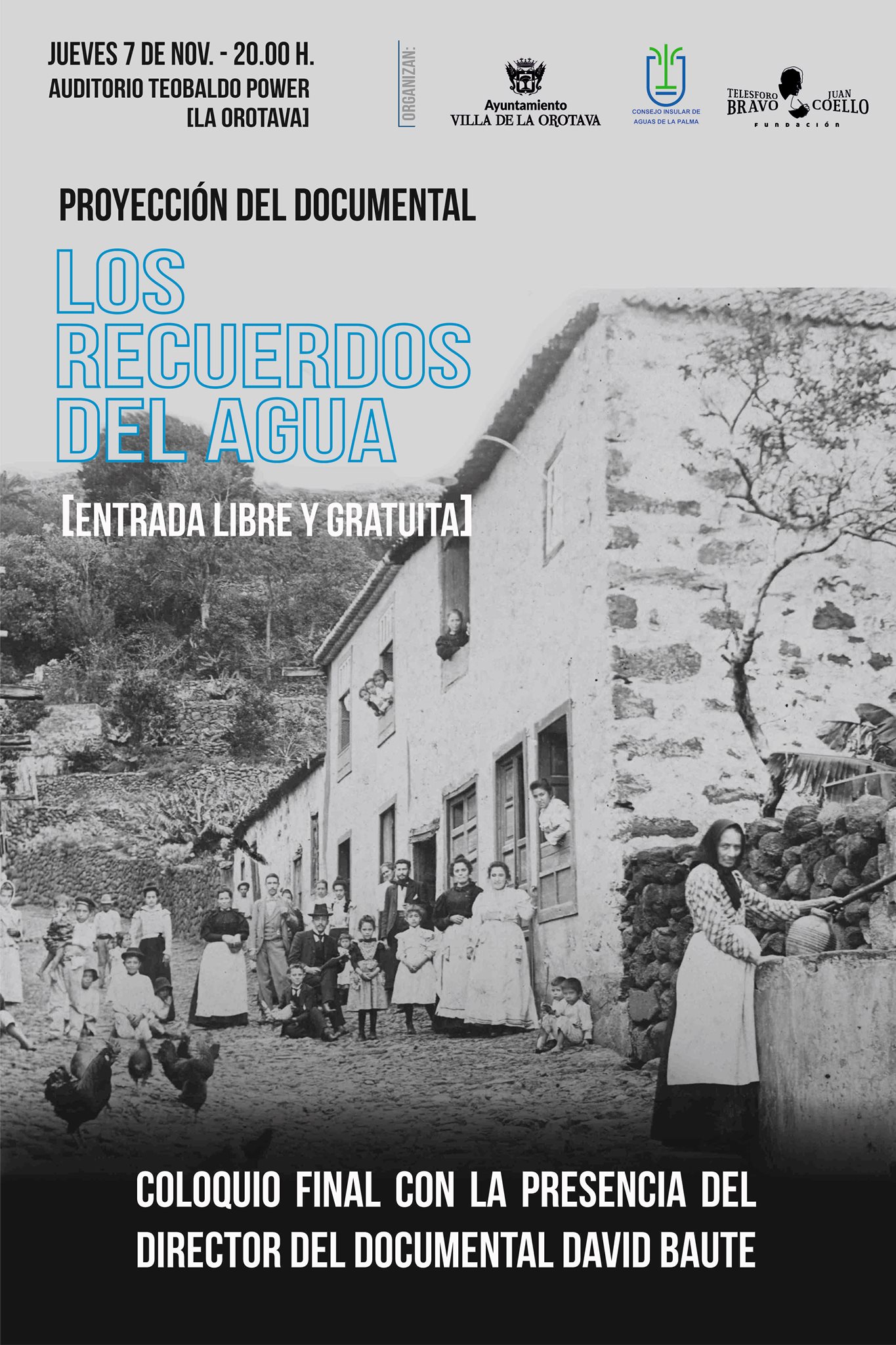 El Auditorio Teobaldo Power acoge el próximo jueves, 7 de noviembre, a partir de las 20:00 horas, se estrena el documental "Los recuerdos del agua", del Consejo Insular de Aguas de La Palma. Esta proyección, primera que se realiza en Tenerife, tiene el objetivo de homenajear a los hombres y mujeres que hicieron posible con un enorme sacrificio, y en algunas ocasiones con la vida, la labor de alumbrar el agua en la Isla.