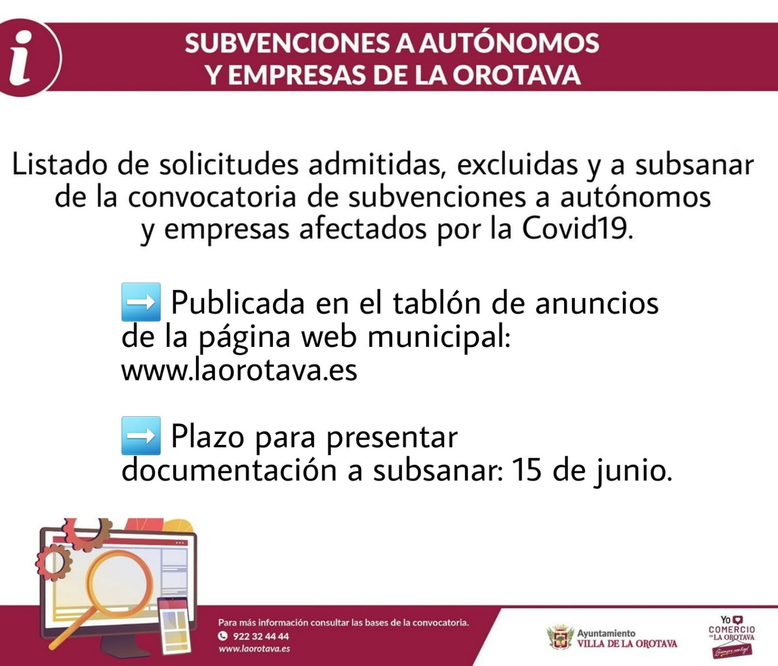 La Concejalía de Economía y Hacienda del Ayuntamiento de La Orotava, que dirige el edil Felipe Díaz, comunicó que. ya se ha publicado el 'Listado de solicitudes adminitadas, excluidas y a subsanar de la convocatoria de subvenciones a autonómos y empresas afectados por la COVID-19'.
