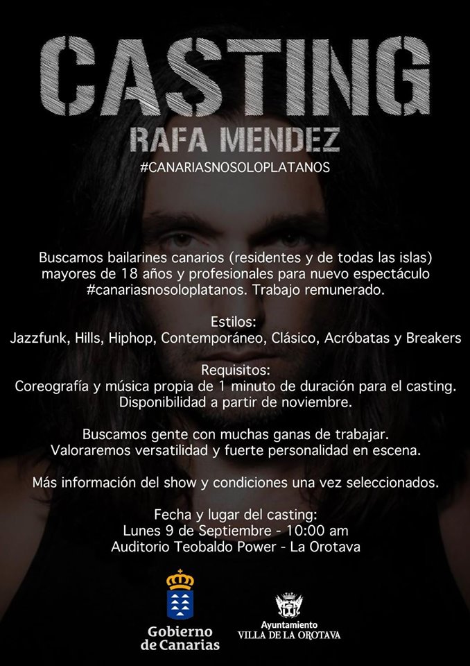 Méndez está buscando artistas exclusivamente canarios, mayores de edad, que sean residentes y de cualquiera de las islas. Deberán tener una coreografía y música propia de 1 minuto de duración para el casting, en cualquier estilo: jazzfunk, heels, hiphop, contemporáneo, clásico, acróbatas y breakers. Los bailarines se darán cita en el citado auditorio a partir de las diez de la mañana, y el conocido bailarín profesional portuense, Rafa Méndez, y el alcalde de La Orotava, Francisco Linares, aprovecharán la ocasión para presentar este nuevo proyecto.