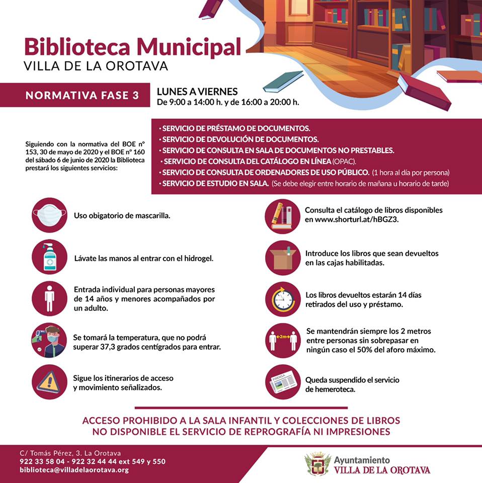12/06/2020La biblioteca municipal de La Orotava abre con horario de 9:00 a 14: horas y de 16:00 a 20.00 horas. Es posible utilizar la biblioteca como sala de estudio pero es necesario pedir cita previa llamando al 922 33 58 04 o 922 32 44 44 ext. 549 - 550.