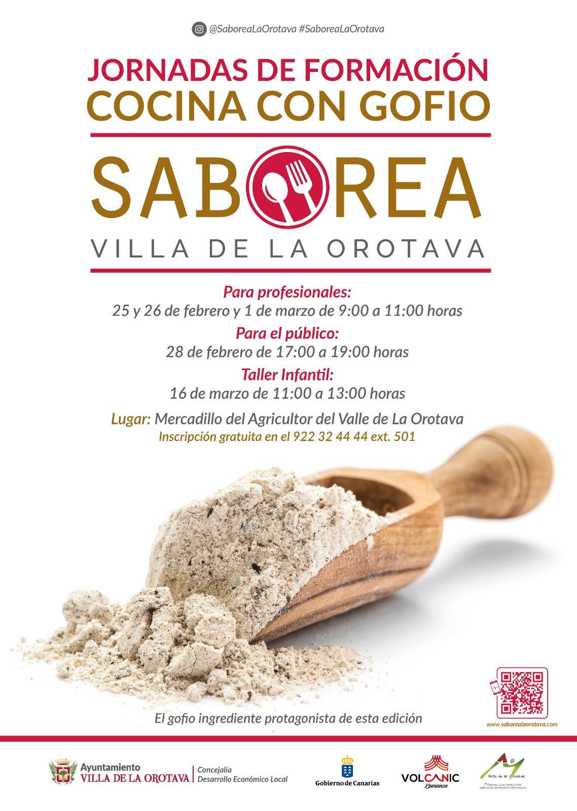 Esta edición de Saborea La Orotava se desarrollará a finales de febrero y principios de marzo. Pretende formar a los cocineros y a aquellos aficionados en el mundo de la cocina, tanto pequeños como mayores, para que conozcan mejor todo lo relacionado con este producto típico tanto en la elaboración de platos y postres como en sus múltiples beneficios. El gofio es una harina elaborada a partir de cereales tostados, principalmente maíz y trigo. Ha formado parte de la gastronomía canaria desde la época prehispánica, tanto en platos salados como dulces. Es muy valorado por los deportistas debido a su alto aporte de nutrientes. Es una excelente fuente de hidratos de carbono y proteínas, además de bajo en grasas y azúcares. Tiene un elevado contenido de vitaminas B1, B2 y B3, así como vitaminas A, C y D. Además, es rico en fósforo, hierro, calcio y potasio.