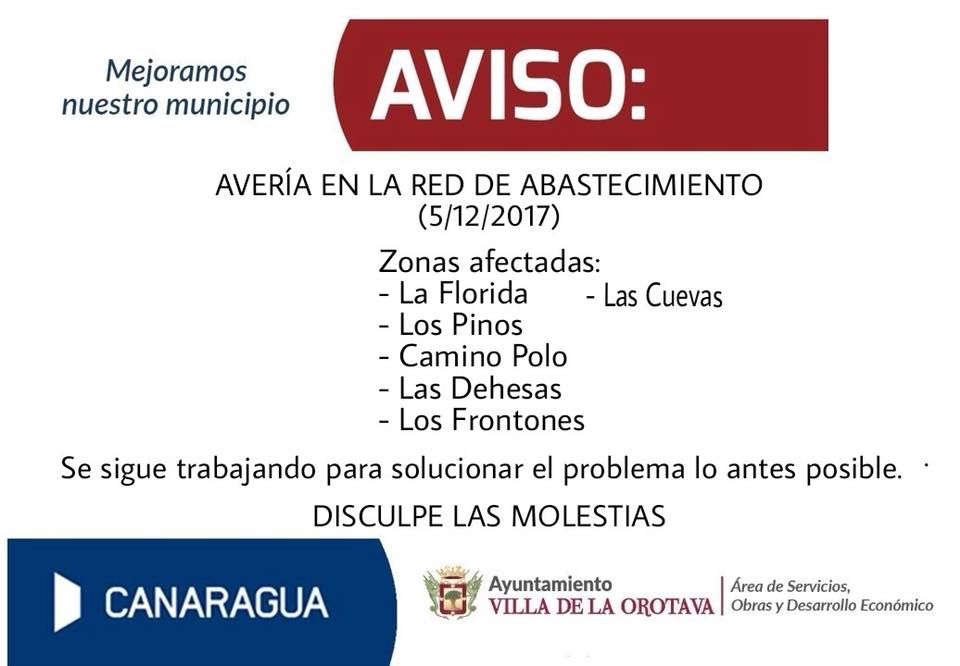 El problema se originó en la canalización desde la galería de Pinolere, y los motivos continúan en investigación. El Ayuntamiento de La Orotava pondrá mañana a disposición de los vecinos dos cubas de agua potable que se localizarán en las Plazas de La Florida y de Los Pinos. Y además se trabaja con una empresa local para el suministro de agua en las zonas más afectadas.