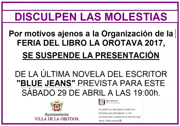 Lamentamos comunicar que, por motivos ajenos a la Organización, se suspende el acto de presentación y firma de libros con Blue Jeans. Acto previsto para mañana sábado a las 18:00 horas en la Casa de La Cultura de San Agustín.