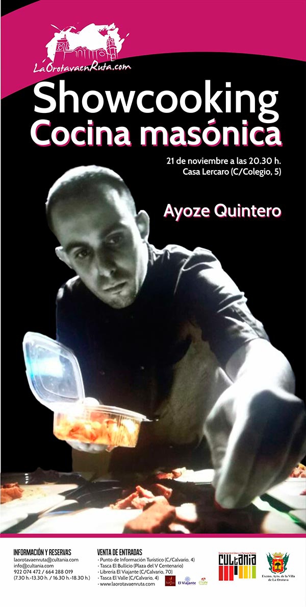 La masonería, la historia y la gastronomía recobran vida en La Orotava. El próximo viernes día 21 de noviembre a las 20:30 horas, en la Casa Lercaro (C/ Colegio, 5), tendrá lugar la celebración del Showcooking: Cocina Masónica, una iniciativa organizada por LaOrotavaenRuta.com en colaboración con el Ayuntamiento villero que pretende combinar gastronomía e historia local desde una perspectiva original.